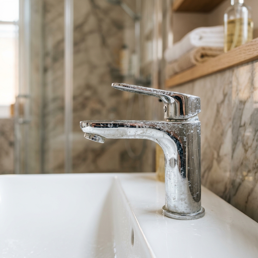 Dies ist das sichtbarste Zeichen. Weißliche Ablagerungen erscheinen auf Armaturen, Duschwänden, Duschköpfen und rund um das Waschbecken. Diese Flecken sind Calciumcarbonat (CaCO₃), das beim Verdunsten des Wassers ausfällt. Je härter Ihr Wasser, desto schneller und hartnäckiger sind diese Ablagerungen.