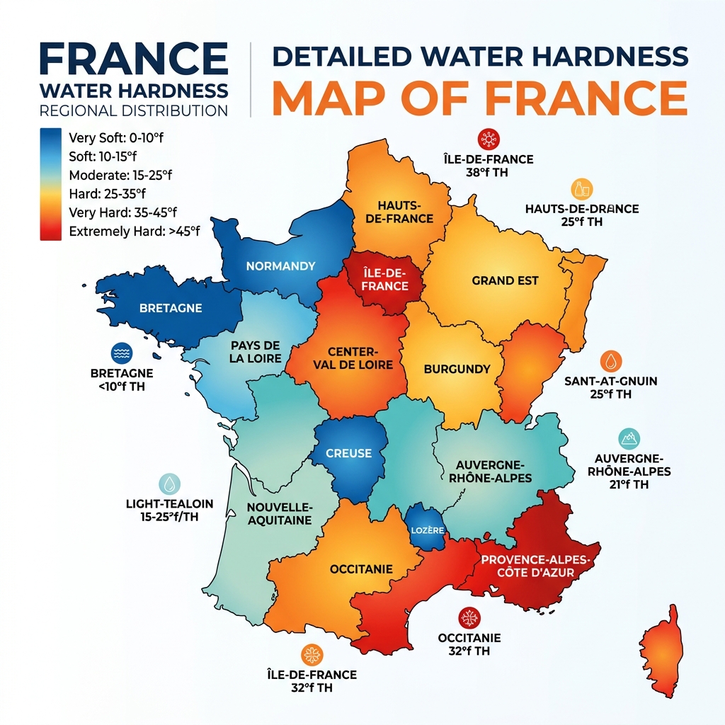 In France, approximately 80% of households are supplied with moderately hard to very hard water (above 15°f). Here is the breakdown by major region, based on data from Regional Health Agencies (ARS) and the qualite-eau.fr portal: