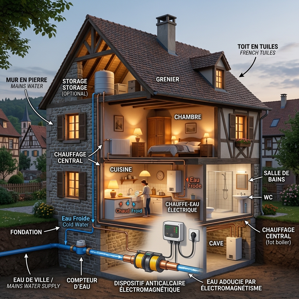 En Francia, el 80% de los hogares recibe agua dura — agua con un título hidrotimétrico (TH) superior a 25°f. El agua dura contiene concentraciones elevadas de calcio (Ca²⁺) y magnesio (Mg²⁺). Las consecuencias son visibles a diario: depósitos blancos en la grifería, piel seca, deterioro de electrodomésticos y sobreconsumo energético.
