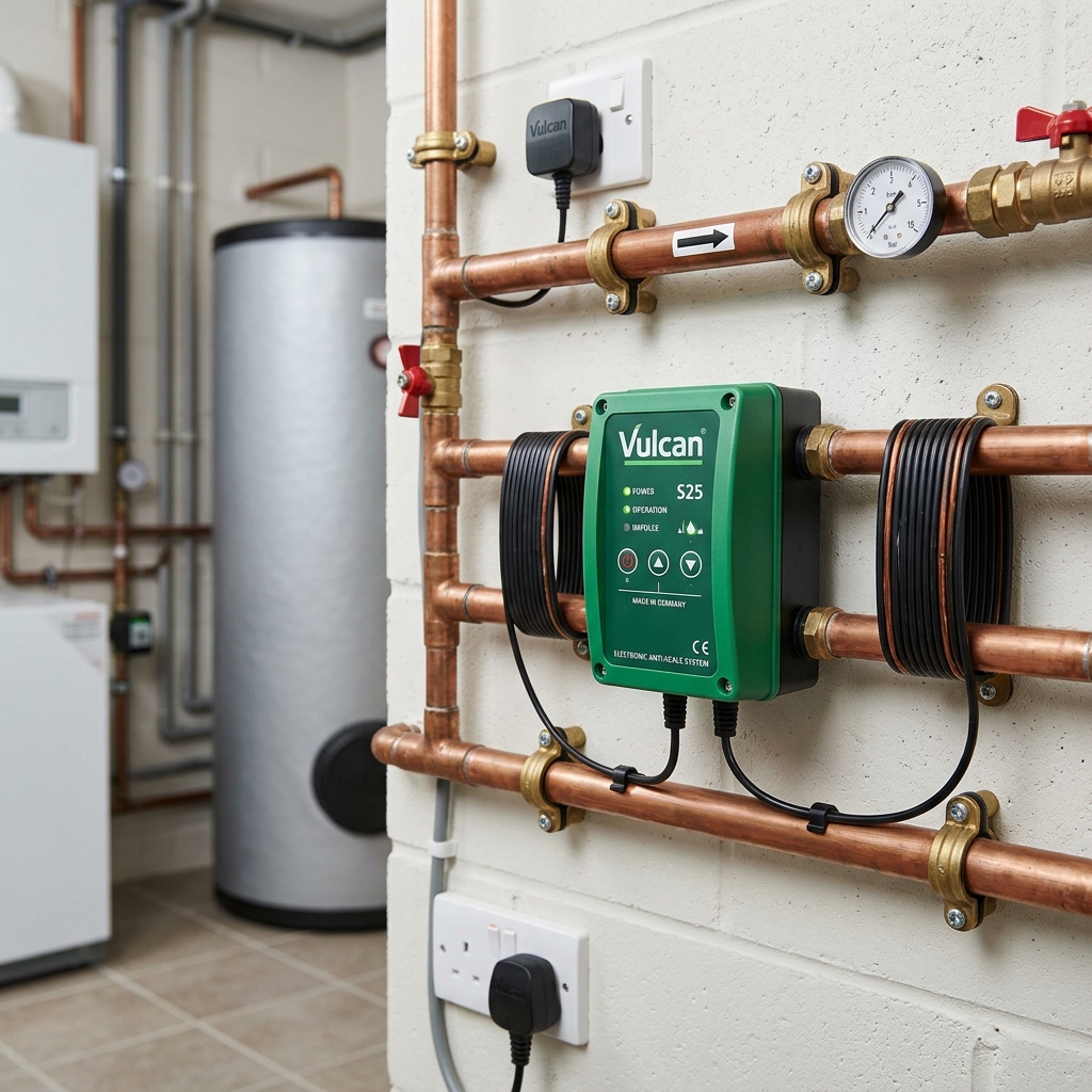 Le Vulcan utilise des impulsions de courant capacitif transmises par des bandes d'impulsion enroulées autour de la canalisation. Ces impulsions génèrent un champ électrique qui modifie la cristallisation du carbonate de calcium (CaCO₃) : au lieu de former de la calcite adhérente (tartre), le calcium cristallise sous une forme non adhérente qui s'écoule avec l'eau.